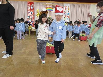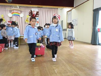 サンタさんをお見送りした後はさくら組さん、ゆり組さんと一緒にクリスマスゲームをして楽しみました。トナカイさん、サンタさんになりきり、さくらさんを乗せたプレゼントを運んで盛り上がりましたよ!