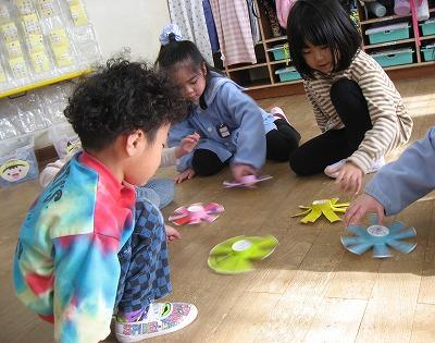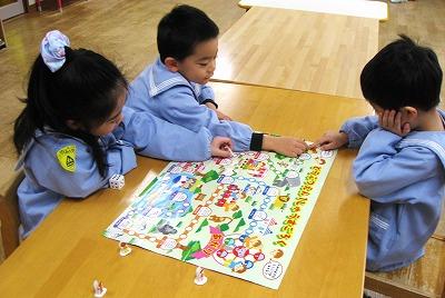 お正月あそびは手作り羽子板での羽根つき、紙コップで作ったこま回し、かるた、福笑い、すごろくを楽しみました。勝負にこだわったり友だちと助け合ったりする姿が見られ、とても微笑ましかったです。まだまだ盛り上がりが続きそうですよ☆