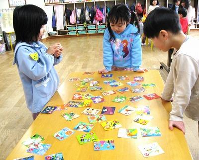 今月はいろいろなお正月遊びをして遊びました。こま回し、カルタ、福笑い、凧あげ、風船つき、けん玉、すごろくなど、子ども達はどの遊びも「やりたい!」と興味津々でした。こまや、凧、けん玉などは自分達で絵を描いてオリジナルのものを作りました。保育士から、やり方を聞きながら何度も挑戦して、できた時は「できたよ!見て!」と自信たっぷりの顔で見せにきてくれましたよ。カルタでは最初は保育士と一緒に遊んでいましたが、段々とルールを覚えて順番など自分達で考えながら楽しんでいる姿も見られました。カルタやトランプ遊びを通して、ひらがなや数字への興味が高まってきている子ども達です。