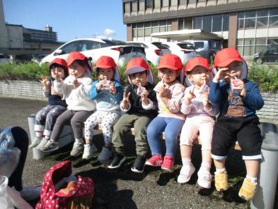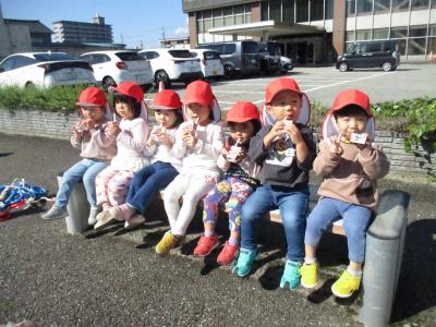 商工ビルまでの長い距離を歩いて疲れ気味だった子どもたちでしたが、ベンチでジュースを飲みながら電車やパトカー、バス、ヘリコプターなどを見て大興奮の子どもたちでした!また、お巡りさんやゴミ収集車の方に敬礼してもらったり、手を振ってもらえたりして嬉しそうにする姿も見られました。