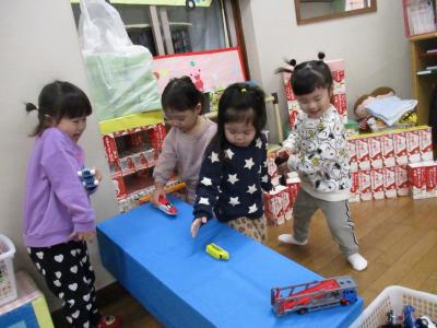 また、友だちと一緒に車を走らせたり、並べてあそぶ姿も見られました。