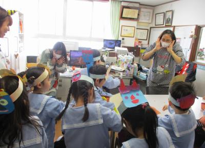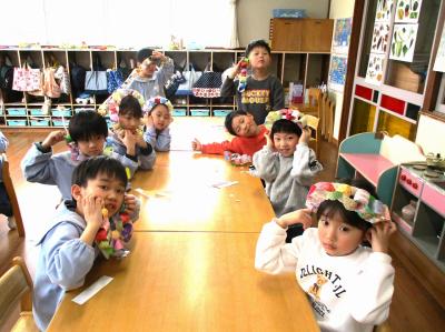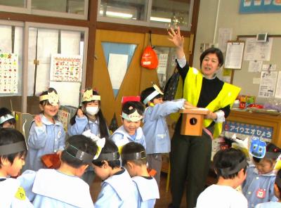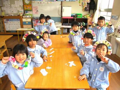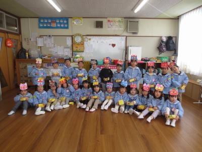 今月は節分があり、手作りしたお面をかぶって、園長先生と一緒に豆まきを楽しみました。最初は福の神になって各クラスや事務所へ回り、最後は自分たちも鬼になって楽しく過ごしました。これで、たくさんの福が舞い込んでくることでしょう!