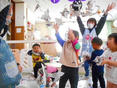 1歳児のお友だちは保育士と一緒に新聞紙を破いたり、”パラパラ”と散らしたりとダイナミックに楽しむ姿が見られました☆
