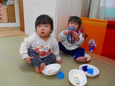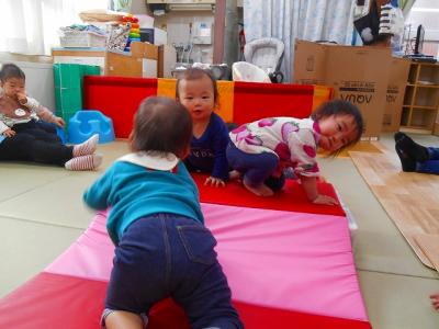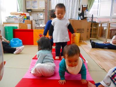 0歳児のお友だちは、少し段差のついたマットをハイハイで慎重に渡る姿は真剣なひょうじょうでした。また、好きなおもちゃでじっくりと遊ぶお友だちもいます!