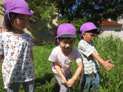 今日は天気も良く、戸外へ出てお友だちと虫や草花を見つけたり、鬼ごっこやジャングルジムなど体を動かして楽しみました。とんぼを見つけて追いかけたり、ねこじゃらしなどの草花を摘んで「見つけたよ!」と色々な発見があったようです。少しずつ移り変わる秋の自然を楽しんでいました。これからも戸外に出て、たくさん体を動かしたり、自然に触れていきたいと思います。