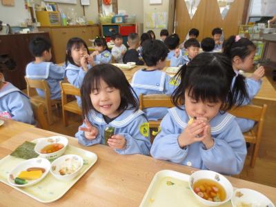 今月は節分があり、手作りしたお面をかぶって、園長先生と一緒に豆まきを楽しみました。最初は福の神になって各クラスや事務所へ回り、最後は自分たちも鬼になって楽しく過ごしました。これで、たくさんの福が舞い込んでくることでしょう!