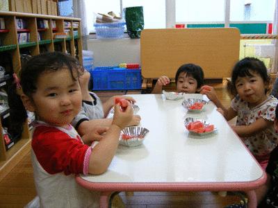 給食時には、箸を持ちたくて「はしで、たべる。」