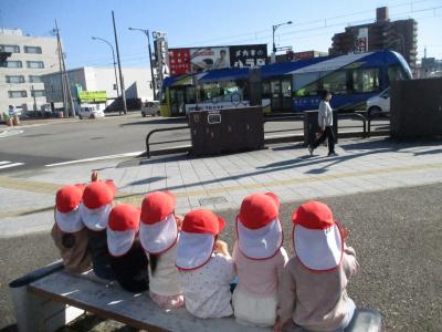 商工ビルまでの長い距離を歩いて疲れ気味だった子どもたちでしたが、ベンチでジュースを飲みながら電車やパトカー、バス、ヘリコプターなどを見て大興奮の子どもたちでした!また、お巡りさんやゴミ収集車の方に敬礼してもらったり、手を振ってもらえたりして嬉しそうにする姿も見られました。