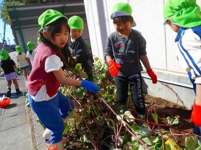 長いつるをみんなで引っ張って、両手で一生懸命に土を掘り、「あ!いもあった!」「でっかいのでた!」など喜ぶ声が沢山聞こえてきました。