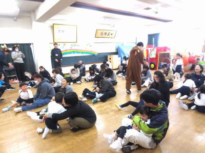 親子運動教室ではお家の方と一緒に楽しいひと時を過ごせて大満足な子ども達でした。保育園では見ることのない、いつもに増してキラキラの笑顔があふれていました。お家の方には、園での様子や友だちとの関わりなど見ていただけたかなぁーと思います。