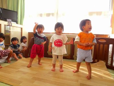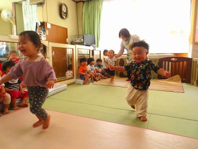 お部屋では運動会ごっこを楽しんでいます!かけっこでは、名前を呼ぶと元気に手をあげ「はーい!」と返事をし、「よーいどん!」の掛け声に合わせてニコニコ笑顔で走る子どもたちですよ☆とても張り切っています♪また晴れた日は散歩に出発!!風が心地よくとても気持ちいです!歩きながら葉っぱを見つけ、「はっぱ!はっぱ!」と嬉しそうに保育士や友だちに教えてくれますよ☆